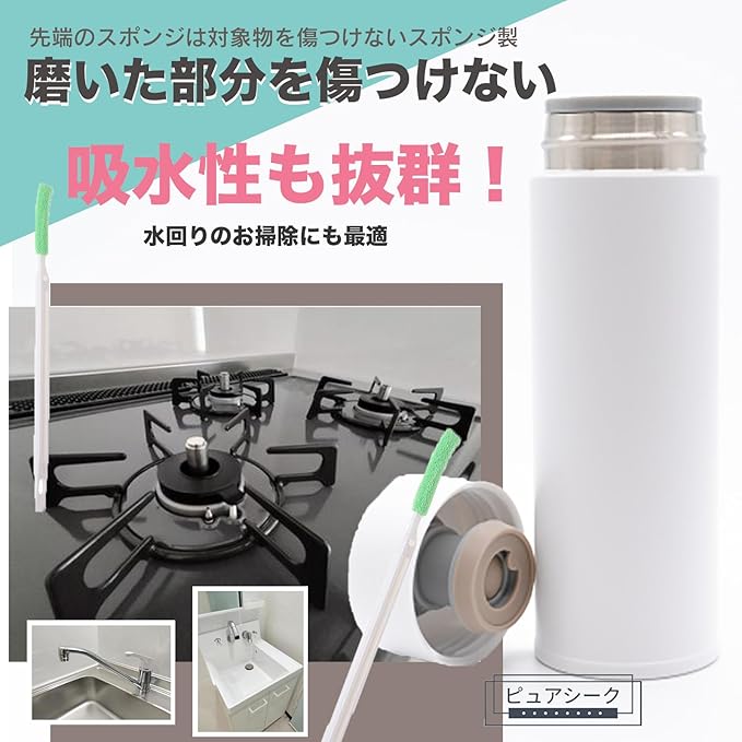 【磨いた部分を傷つけない】先端のスポンジは対象物を傷つけないスポンジ製で出来ています。吸水性にも優れていますので、水回りのお掃除にも最適です。