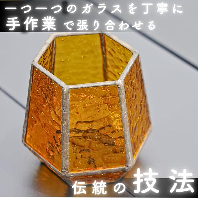 【すべてが手作りのステンドグラス 一枚ずつ異なるガラスを、職人が手作業で丁寧に繋ぎ合わせて作られたステンドグラスホヤ。一つひとつが異なる表情を持ち、世界に一つだけの特別なランタンに仕上がります。大量生産にはない、味わいとぬくもりを感じられます。