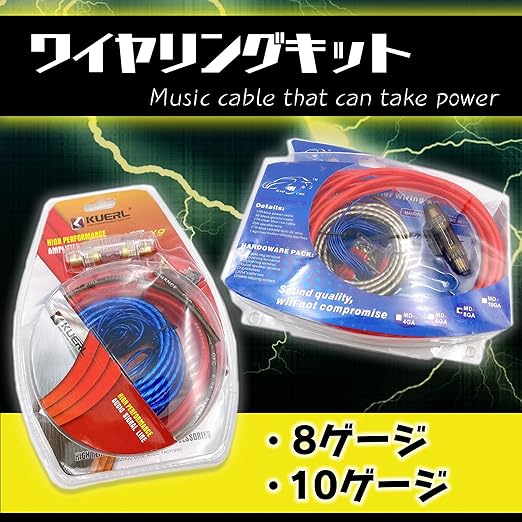 セット内容 【10ゲージ】 ・電源ケーブル (約430cm) ・アースケーブル (約50cm) ・リモートケーブル (約430cm) ・RCAケーブル (約450cm) ・平端子 2、丸端子 2、ゴムキャップ 4 【8ゲージ】 ・電源ケーブル (約430cm) ・アースケーブル (約50cm) ・RCAケーブル (約450cm) ・リモートワイヤー (約450cm) ・平端子 2、丸端子 2、ゴムキャップ 4