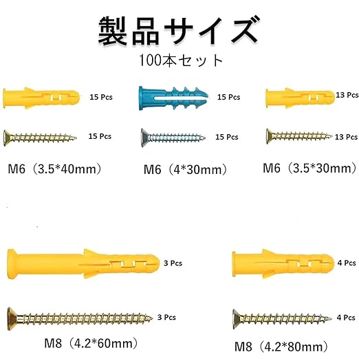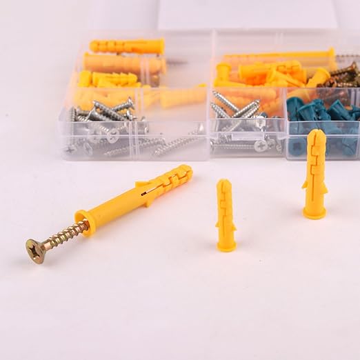 【セット内容】合計100pcs。拡張ウォールプラグアンカー50個、セルフタッピングネジ50個入り。 収納ボックス付き。