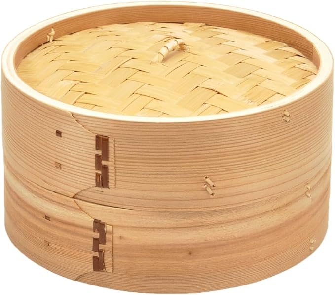 杉で出来た円形の枠を桃皮で留め、蓋部分と、スノコ部分には孟宗竹を使用した天然素材だけで作られた中華セイロです。