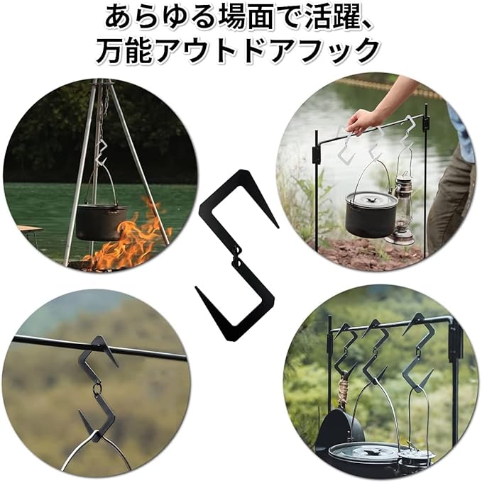 多目的に使用可能 - アウトドアフックは高強度、耐蝕性、耐熱性に優れているので、さまざまな用途で使用することができます。キャンプや釣り、ハイキングなどのアウトドアアクティビティーにはもちろん、自宅の庭やベランダでも使用することができます。また、タオルやランタン、鍋などのアイテムを吊るすのにも最適です。