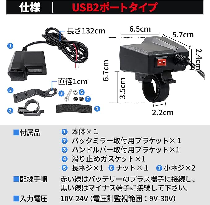 バイク用デュアルUSB+電圧計(シガーソケット付) 【デュアルUSB充電ポート】 合計出力3.4Aで、携帯電話、タブレット、ナビゲーション、GPSなどの2つの電子機器に同時に効率的に電力供給可能。 【防水・防塵カバー搭載】 環境にやさしい素材を使用した防水・防塵設計で、雨や埃から製品を守り、耐久性を向上させます。 【リアルタイム電圧監視】 搭載された電圧計がバッテリー電圧をリアルタイムで監視。低すぎる電圧や高すぎる電圧から発生する隠れた危険を防ぎます。 【車種選ばない汎用性】 DC10~24Vで多様なバイクに適応。 【独立したスイッチ】 電圧計とUSB充電ポートを同時に制御可能。オンオフを切り替えて電力消費を抑制できます。 【2通りの取り付け方法】 ハンドルバー取り付け/バックミラー取り付けが可能。自分の好みに合わせて選択できます。 【長い配線】 バッテリーに直接取り付け可能で、バイクのデザインに合わせた柔軟な設置が可能。配線手順も簡単。 【便利なアクセサリー】 ハンドルバー取付用ブラケット、バックミラー取付用ブラケット、滑り止めガスケット、長ネジ、小ネジ、固定用ナットが付属。取り付けが簡単です。