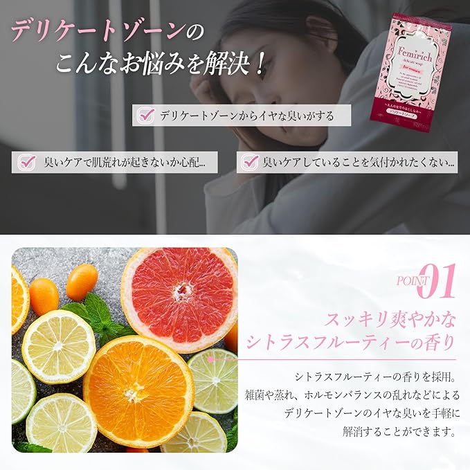 Femirichカシベルデリケートソープ ・天然保湿成分カミツレエキス配合 ・お肌に優しい弱酸性 ・シトラスフルーティーの香り ・大切なデリケートゾーンお使いいただける洗浄料 ・持ち運びに便利な小袋入り ご使用方法 お肌を軽く濡らし、適量を手に取りご使用ください通常の洗浄方法と同じように洗い流してください