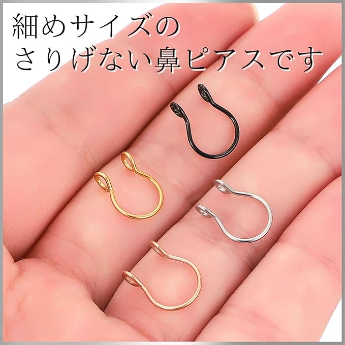 細めのさりげないフェイク鼻ピアス2個セット。大小サイズが各1個入りですのでサイズに不安のある方でも安心してお試しいただけます。ピアスホール不要のノンホールピアスなので、痛くなく手軽に楽しめるU字型アクセサリーです。 「鼻にピアスは開けたくないけど、ストリート系ファッションに憧れる」「韓国風にチャレンジしたい」そんな方に最適なフェイクピアス。ピアス穴がなくても使えるノーズカフは、ユニセックス・ミニマルデザインで、カップルやペア使用にもおすすめ。 ピアスホールがなくてもOK。挟むだけのノンホール仕様で、初めての方でも痛くない安心設計。ステンレス素材を使用しており、アレルギーに配慮した作り。鼻ピやセプタムピアスのような見た目を楽しめる、トレンド重視のアクセサリーリングです。 U字型の本体を軽く広げ、鼻(ノーズ)の中央にそっと挟むだけ。耳にも使える多用途仕様で、気分やシーンに応じて自由にアレンジ可能。ノーズリング・鼻リング・ノーズピアス風の演出も可能で、日常使いからイベントまで幅広く対応します。 セット内容は、0.8mm 8mmと0.8mm 10mmの2サイズが各1個の2個セット。2個同時に装着したり、男女ペアでのシェアもおすすめです。カラー展開はシルバー・ブラック・ゴールド・ピンクゴールドの4色。軽量で肌に優しいステンレス製。