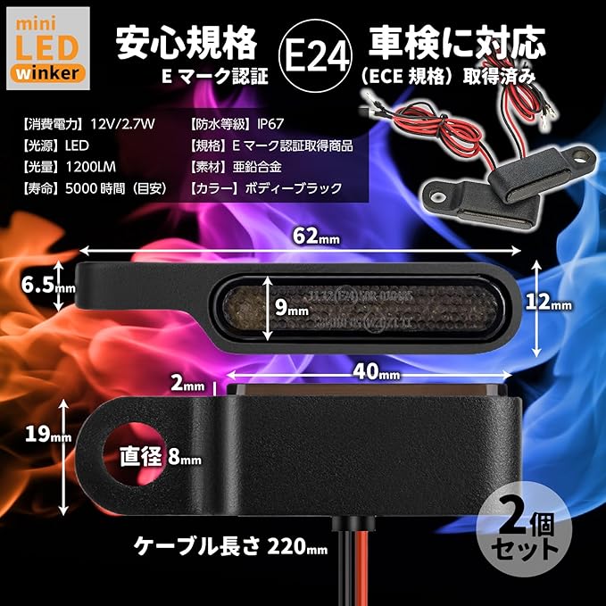 【寸法】本体:幅62 奥行き19 高さ12mm、ライト:幅40 高さ12mm【取り付け穴】M8【コード長】約22cm【機能】シーケンシャル(流れるウィンカー)、ポジションホワイト【ライト色】アンバー/ホワイト【防水等级】IP67【消費電力】12V/2.7W【光源】LED【光量】1200LM【寿命】5000時間(目安)【規格】Eマーク認証取得商品【素材】亜鉛合金【カラー】ボディーブラック※モニターの環境により、色の見え方に若干差が生じる場合がございます。