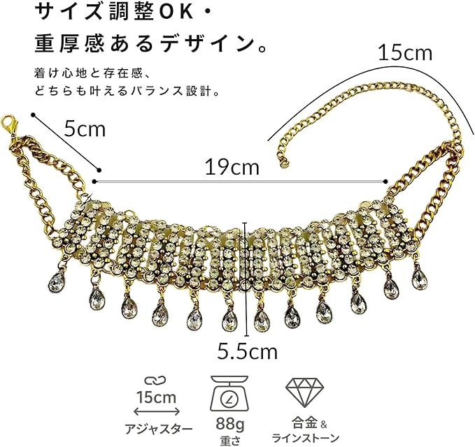 【全ダンサーの夢を形に。あらゆるレベルのダンサーに対応する洗練されたデザイン】 初心者からプロフェッショナルまで、すべてのダンサーが使用できるように考え抜かれたデザインです。豪華なデザインで、クリスタルのラインストーンが輝きを放ちます。ジプシーやトライバルの要素が取り入れられており、セクシーで魅力的な印象を与えます。また、マーメイドやサイーディー、オリエンタルな雰囲気も持ち合わせており、様々なダンススタイルに対応しています。特別なパフォーマンスやイベントのためだけでなく、毎日の練習にも適しています。このチョーカーを身につければ、どんな舞台でも自信を持って表現できます。
