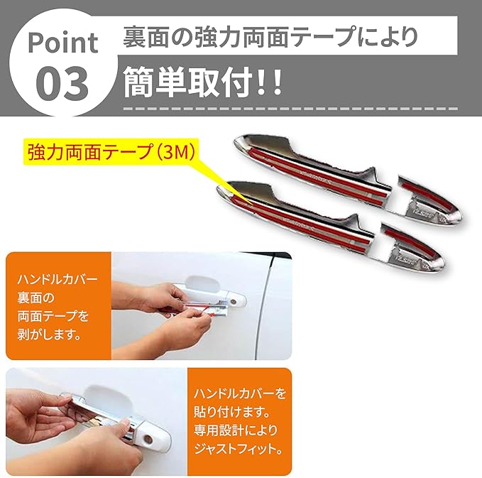 簡単取付 : 裏面には強力な3M両面テープが付いており、簡単に取り付けできます。車両に専用設計された立体加工を施しているため、ピッタリとフィットします。