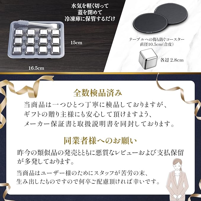 各辺2.8cmの大きめの誤飲防止サイズで、保冷力・安全性を両立。 アイスキューブ12個(2〜3杯分)/コースター2枚/蓋付きケース/トング/説明書/180日保証書/BOXサイズ:17 12 高さ5cm