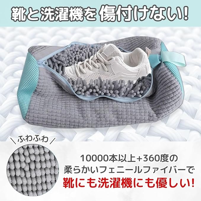 【靴と洗濯機に優しい】10000+本以上&内側360度全面を覆い尽くすフェニールファイバーにより効率的な洗浄を実現!柔らかく微細なもこもこ突起が靴の表面を優しく&徹底的に洗浄してくれまさす。外側もふわふわな素材のおかげで、靴も洗濯機も傷付けません!洗濯機の騒音防止にも役立ちます。