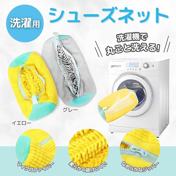 【とても簡単に使える】洗濯ネットに靴を入れてチャックを締め、洗剤と一緒に洗濯機に入れるだけ!洗濯機は通常モードで、洗剤はいつもご利用のものでOKです。洗濯ネットには小さな引っ掛け用タグも付いているので、使用後はそのまま吊るして干していただけます♪