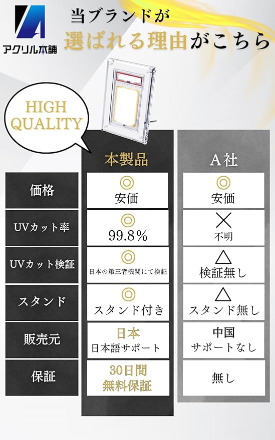 ✅【両面UVカット率 99.8%】アクリル本体にUVカット機能 を搭載。日焼けによる変色、劣化、色褪せを防ぎ、大切なカードを 紫外線 によるダメージから守ります。蛍光灯の光でもカードが 色落ち することなくディスプレイ可能です。第三者機関にて試験済み