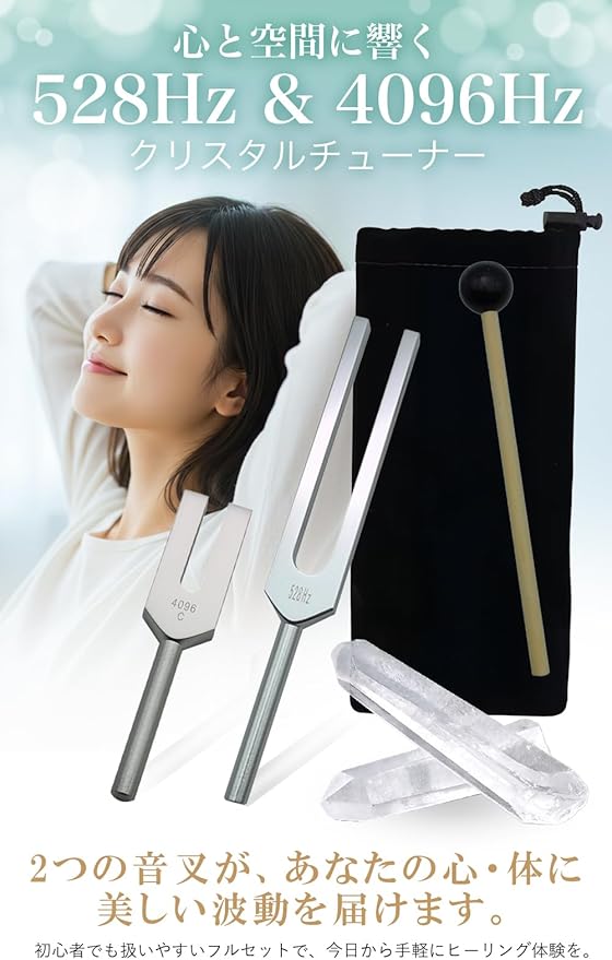 【癒しとバランスの追求】528Hzの周波数を持つ音叉(クリスタルチューナー)のセットです。音による癒しと心身のバランスを追求するためのヒーリングセットとして、特定の周波数を使用して心と体を調和させ、内なる平穏を見つけるための道具として活用できます。