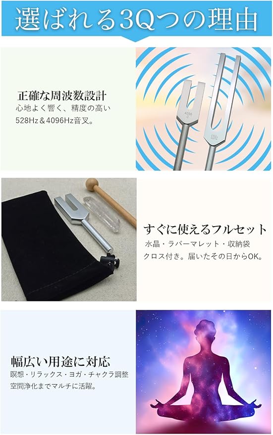 【ユニークな効果】528Hzは「愛と調和」を象徴しています。このセットは、リラックス、瞑想、ヒーリングなど、心と体の安らぎに特定の意味や効果を持つとされています。