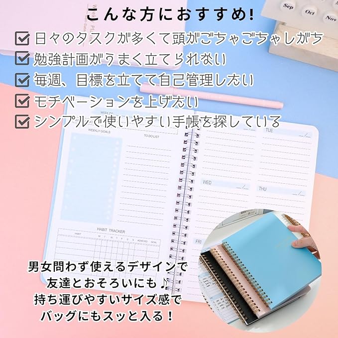 ✅持ち歩きやすいサイズ感 リュックやトートにすっぽり入るのも嬉しいポイント。テスト前の計画立てや、長期休みにやりたいことリストをまとめるのにもぴったり!紙に書くって、意外と気持ちが整理されてスッキリするんです。スマホだけじゃうまくいかない…って人にもおすすめ。1年後、「頑張った自分」に出会える一冊です◎ ✅年間を通じて使えるこのウィークリープランナー「日々を少しずつ整えたい」「時間を大切に使いたい」「自分のペースで目標に向かいたい」そんな方にぴったり。小さな積み重ねが、大きな成果につながります。このプランナーがあれば、「なんとなく過ぎちゃった1週間」から卒業!予定もタスクも習慣も、1冊でぜんぶまとめて管理できるから、自然と毎日がちょっと前向きに。あなたの1年を、52週かけてじっくり育てていきませんか?