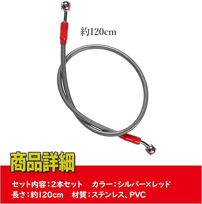 ブレーキホース2本セット:バイク用の約120cmのブレーキホースの2本セットです。この商品1つでバイクのブレーキホース左右両方を交換することができます。しっかりとしたステンレス製で、強度も抜群です。断熱性に優れたPVC素材で覆われているので、ホースの膨張や破損などの問題が起こりにくいです。