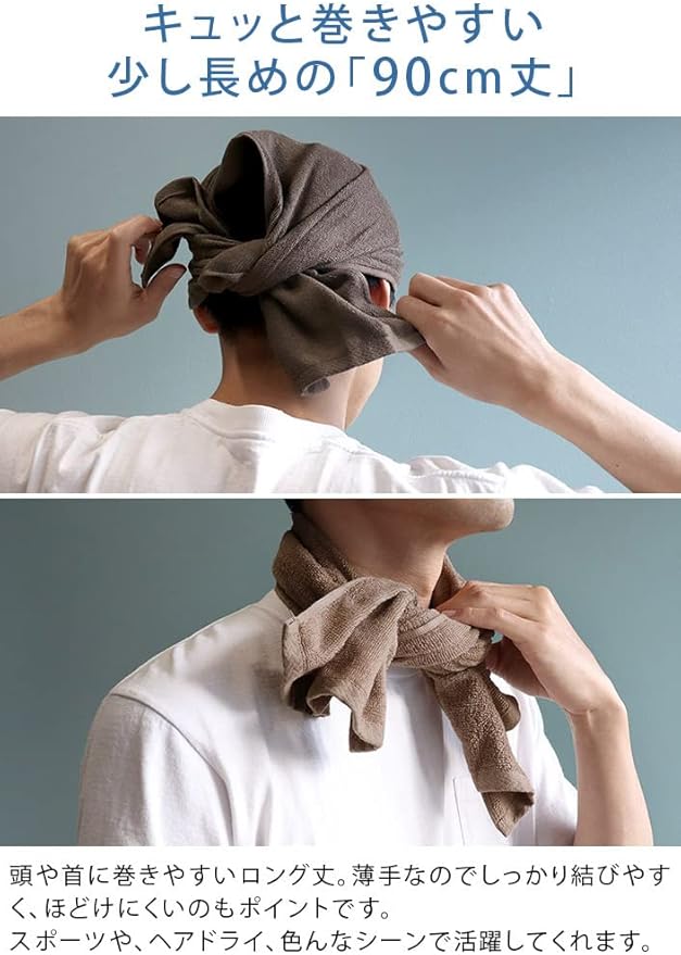 【頭に巻けるロングサイズ】タオル職人のこだわりが詰まった「男性のためのタオル」。通常のフェイスタオルと較べて、少しだけ丈が長いのがこのタオルの特徴。お仕事中、ジョギング中、お風呂上がりのヘアドライ…色んなシーンで頭に巻く時に、この「ちょっとだけ長い」というのが便利なんです。薄手タイプなのでしっかり結びやすいので、作業中にほどける心配はありません。