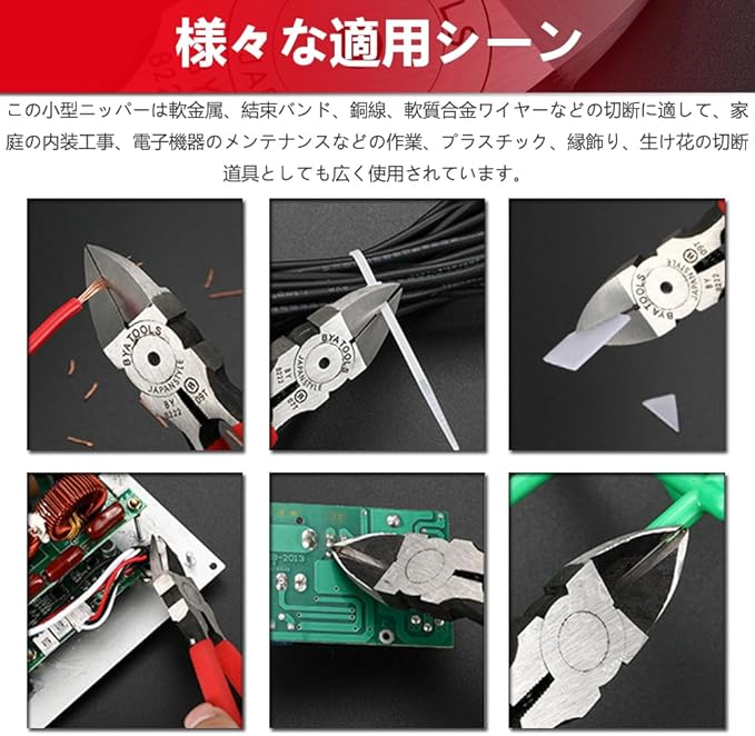 【様々な適用シーン】この小型ワイヤーカッターは軟金属、結束バンド、銅線、軟質合金ワイヤーなどの切断に適して、家庭の内装工事、電子機器のメンテナンスなどの作業、プラスチック、縁飾り、生け花の切断道具としても広く使用されています。