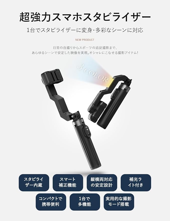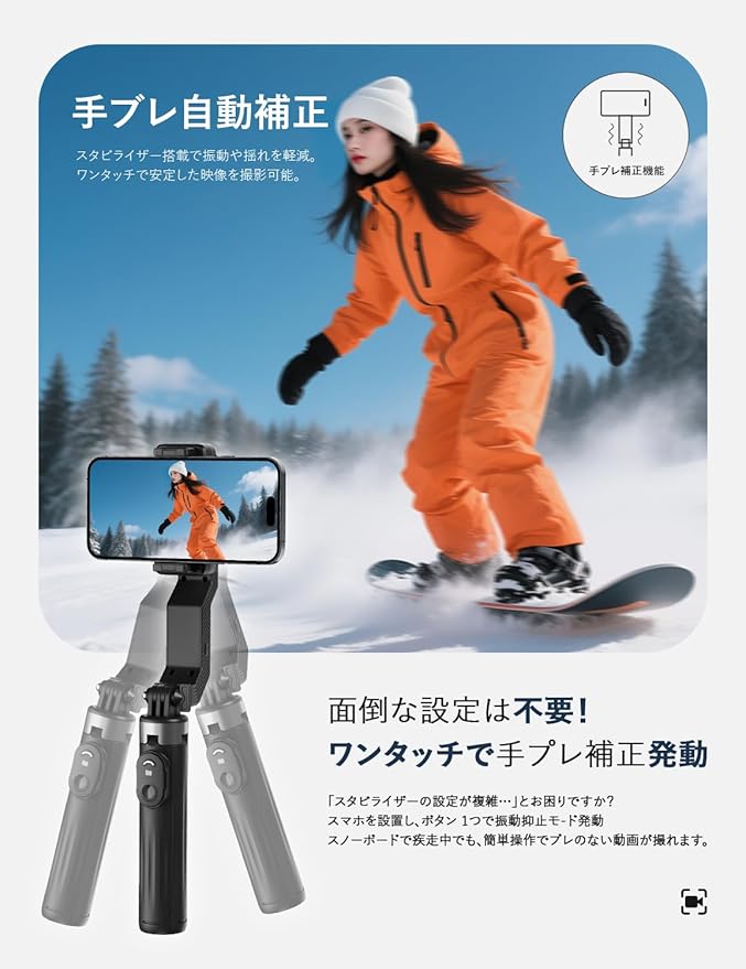 【スタビライザー機能つきセルカ棒!】本製品は片手持ちタイプの電動スタビライザー(ジンバル)を採用。内蔵の高性能ジャイロセンサーとモーターが、歩いている時や移動中の手のブレをリアルタイムで検知・補正します。「歩きながらでも超安定!プロのような滑らかな動画・写真が手軽に撮れる」。旅行の風景撮影、Vlog、子供やペットの自然な動きを記録する場面でも、まるでプロが撮影したような高品質の映像を誰でも簡単に撮影可能。