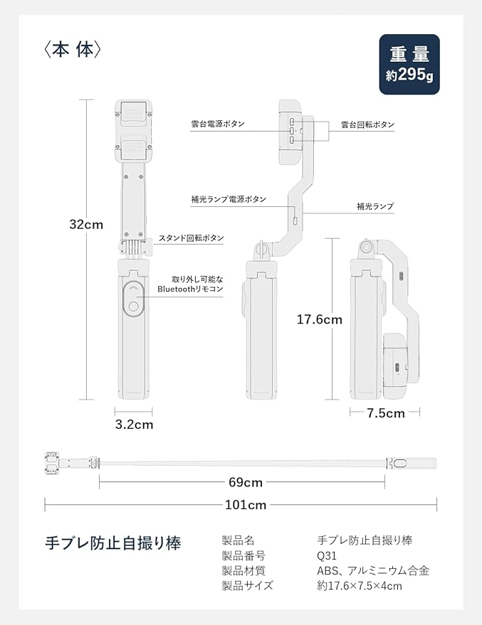 【1本で3役 |自撮り棒・ジンバル・三脚】このジンバルは、最大101cmまで伸ばせる8段伸縮式セルカ棒として使えるだけでなく、底部のハンドルを開くだけで自立式四脚スタンドに変身。生放送やビデオ通話の時両手を解放でき気楽にお話でき、スマホスタンド、卓上スタンドとして使用してもいいです。多機能による汎用性の高さ、様々な撮影シチュエーションへの対応力、持ち物の最小化(3役1本で済む)、アウトドアや旅行の必需品です。