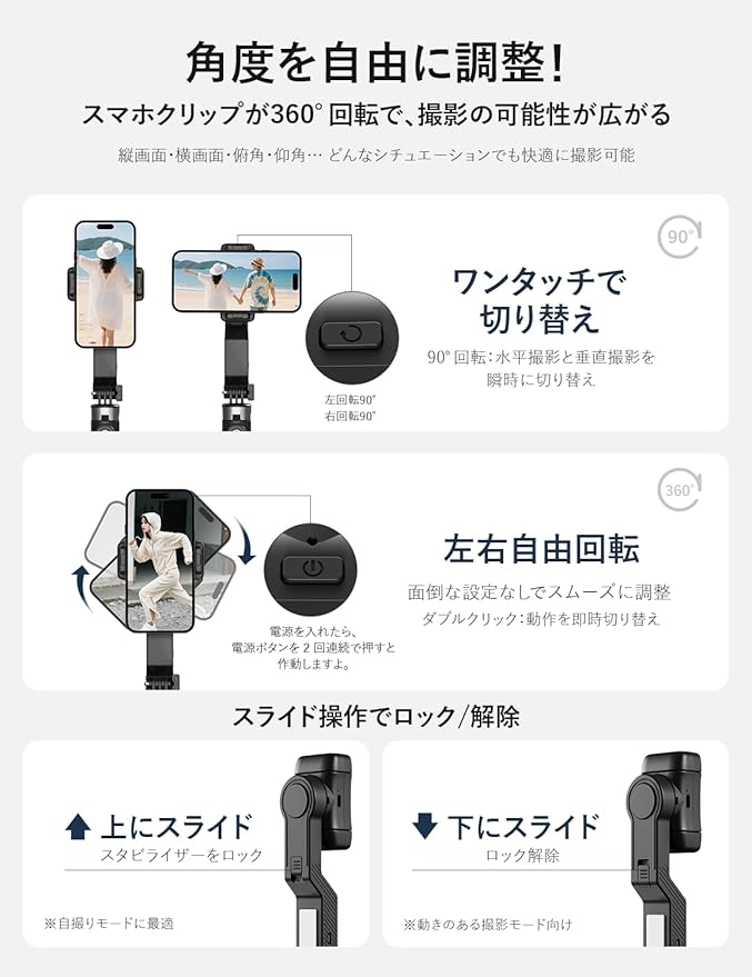 【横向き・縦向きワンタッチ切替|角度を自由に操れ!】本製品のジンバルは、撮影スタイルに応じて水平(ランドスケープ)と垂直(ポートレート)を簡単に切り替えられる設計。電源ボタンを1回押すと右回転で、2回押すと左回転で視角が切り替わります。パンチルトが有効な状態では、手が動いてもスマホは同じ角度をキープし、安定したフレームで動画撮影が可能です。旅行先での風景、友人との記念写真、SNS用リール動画など、あらゆるシーンで活躍します。 ※ご使用前には必ずバッテリー残量をご確認ください。バッテリー切れの場合はUSBケーブルで充電してからご使用ください。