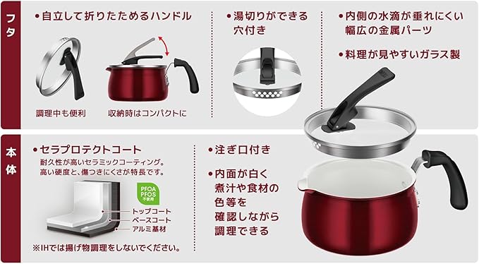 素材:【本体:表面加工】内面:セラミック塗膜加工 / 外面:(底面を除く)焼付け塗装 【本体:材料の種類】本体:アルミニウム合金 / はり底:ステンレス鋼(クロム13%)(底の厚さ2.9mm(はり底を含む))/ 取っ手:フェノール樹脂【フタ:材料の種類】ガラス:強化ガラス / 金属リング:ステンレス鋼 / ハンドル:ナイロン