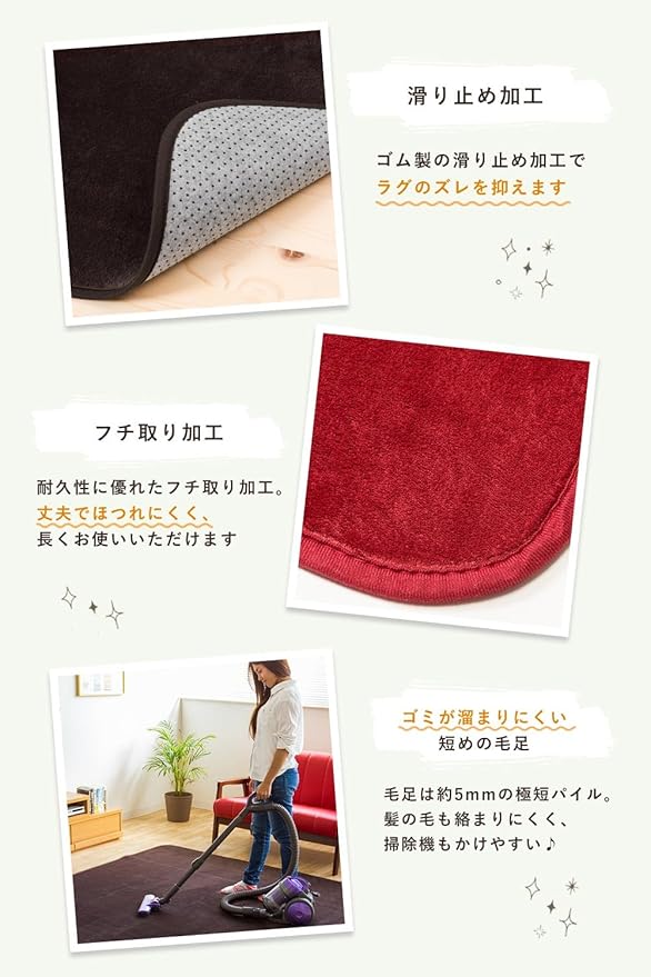 【一年中ずっと使い続けられるラグ】耐熱加工を施しているため、冬はホットカーペットや床暖房と併用して暖かい空間に。夏などの蒸し暑い日でも、毛足が短いのでべたつかず、さらさらで気持ちいい肌触りとなります。豊富な色味やサイズを揃えているので、季節によって色を変えてお部屋の模様替えとしてもいかがでしょうか?