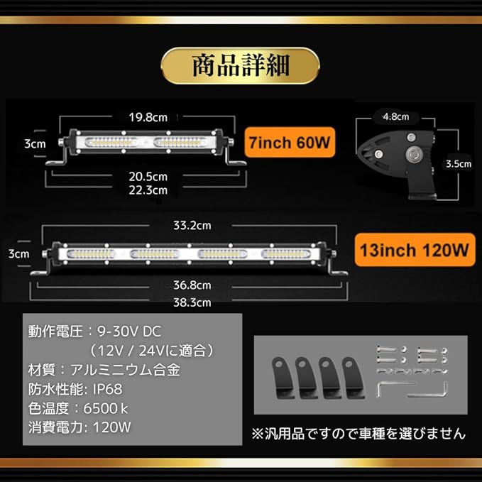 【仕様】サイズ(約):120w 33cm 5cm 3cm / 素材:アルミニウム合金製(本体) / 動作電圧: 9-30V DC(12V / 24Vに適合) / 消費電力: 60W120W/1個 / 防水性能: IP68 / ルーメン:8000LM 12000LM/1個 / 色温度: 6500K / LEDバルブ寿命: 30000時間以上 / セット内容: LEDライト1個(取付ネジ1式)