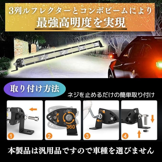 12V、24V兼用の非常に明るいLEDワークライトバー(60w/120w)になります。普通車はもちろん、 オフロード車、トラック、ダンプ、船舶、重機、農作業、トラクター、コンバイン、フォークリフトなどにもお使いいただけます。