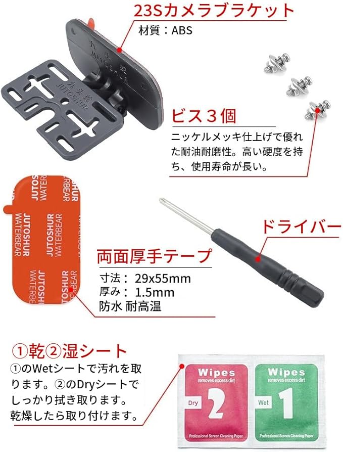 ドライブレコーダーのリアカメラをリアウインドウに取り付けるブラケットです。 リアカメラの固定が両面テープでしっかり綺麗に固定できます! さらにリアカメラの角度調整ができます! 専用のプライマー(下地処理剤)が付いており、強力に固定できます!