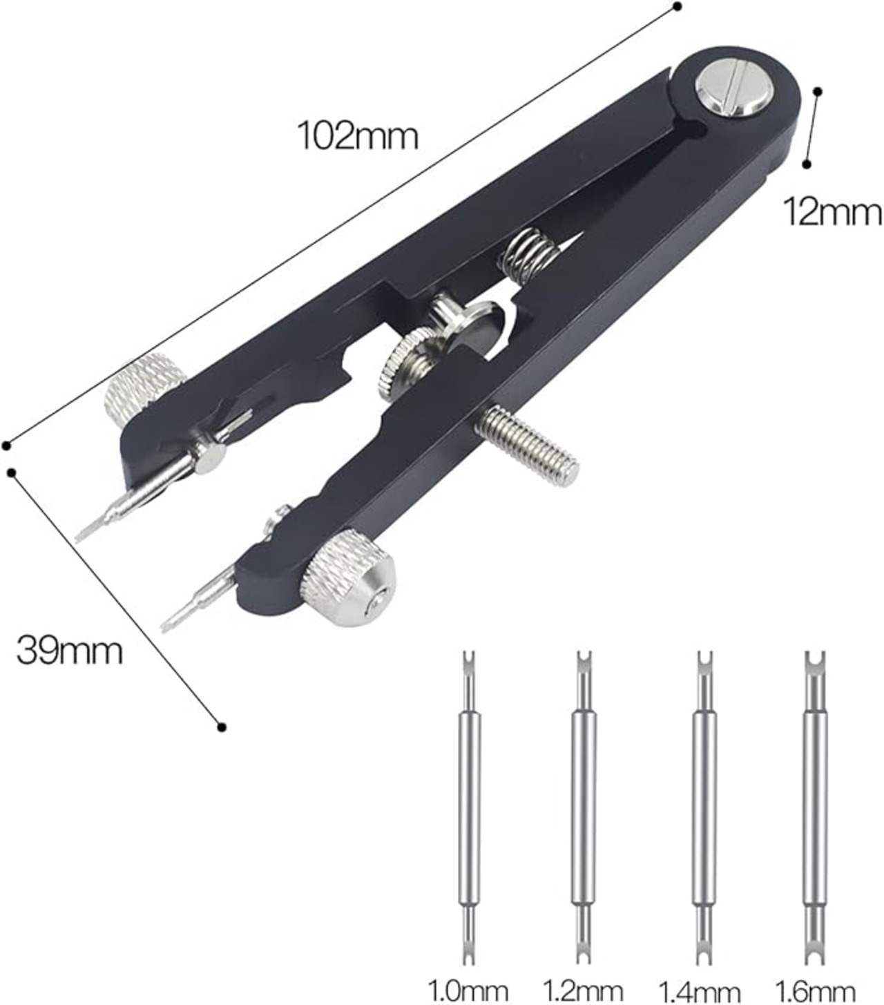 長さは10CMで、ツールには4セットのユニバーサル交換可能ピンフォークが含まれ、4つの異なるリバーシブルピンエンドフォークサイズのオプションがあります。ツールは、最大30mm(5mm〜30mm)までの任意のスプリングバー幅に調整できます。時計ケースのラグ、時計のブレスレット、バンド、またはストラップの間に収まります。市場のほとんどの時計限定商品に適しています。