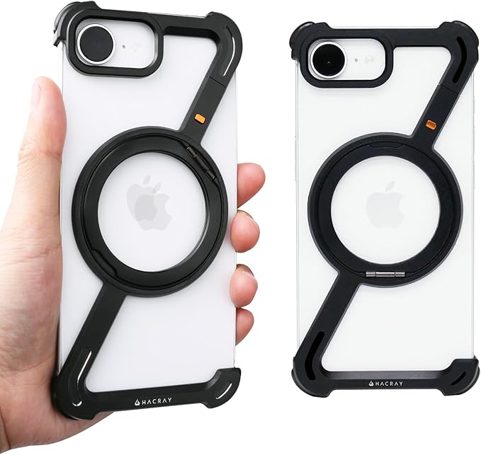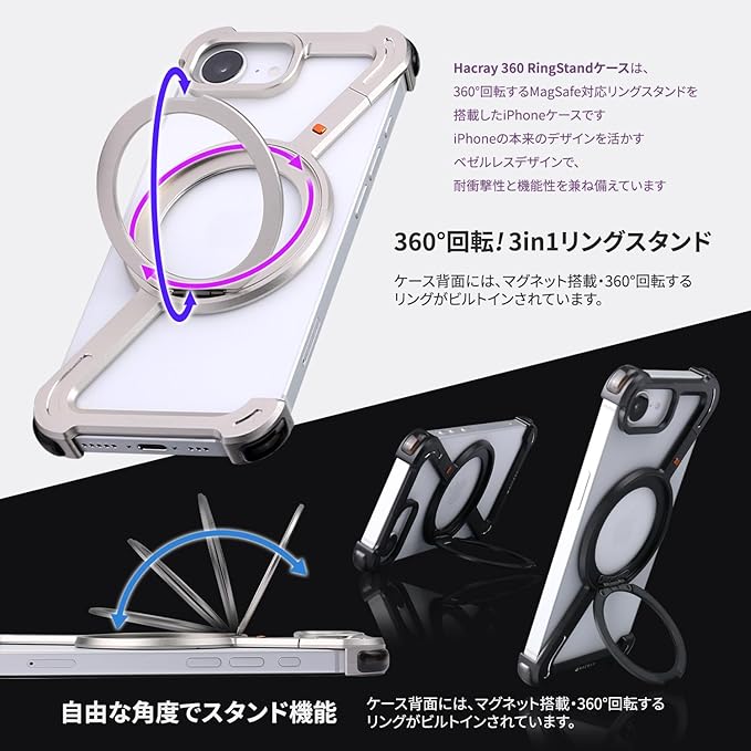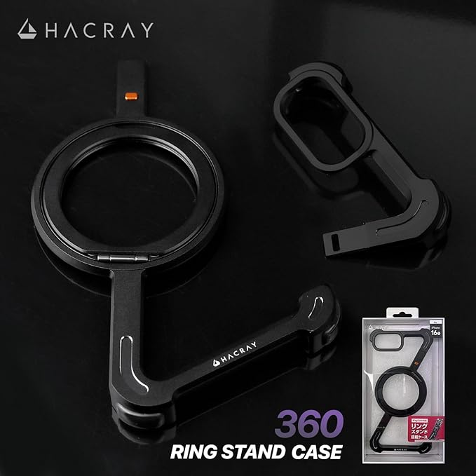 Hacray iPhone 16e ケース アルミバンパー 360 回転 Magsafe対応リングスタンド ケース [ ベゼルレスデザイン 多機能スタンド アルミ合金 四隅エアバッグ 衝撃吸収 高耐久性 落下防止 スマホグリップ ] HR27577iSE4 ブラック【国内正規品】