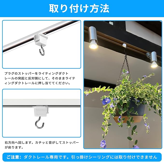 2、【特長】ダクトレールにはめて半回転させるだけなのでとても簡単に設置できます。ドライフラワーのスワッグなど軽いものを引っ掛けるのに使用しています。フックがあると色々アレンジできますし、フックにグリーンを飾ると部屋の雰囲気も変わってなかなか良いですね。