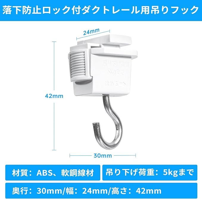 1、【仕様】ライティングレールからディスプレイやPOPなどを吊り下げるときに使用します。 色:ホワイト 重量:12.5g 材質: ABS、軟鋼線材 吊り下げ荷重:5kgまで 奥行:30mm/幅:24mm/高さ:42mm 保証期間:1年保証