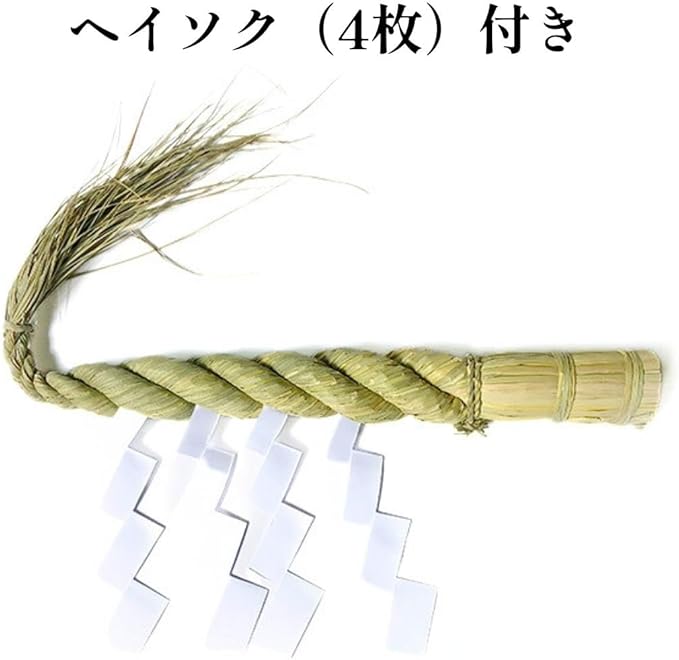 神様をお祀りする神棚に飾ります 4尺(120cm)の神棚用です 【飾り方】 しめ縄にヘイソク(紙)4枚を均等な間隔で取り付けます 太い方を右にして神棚に飾ります