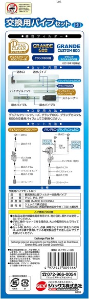 デュアルクリーンシリーズ、グランデ600、グランデカスタム600の交換用パイプとしてご使用ください。 ・セット時は、魚の出し入れ、点検、掃除など水中に手を入れる時は、必ず水槽で使用している電気製品全ての差し込みプラグを抜いてください。
