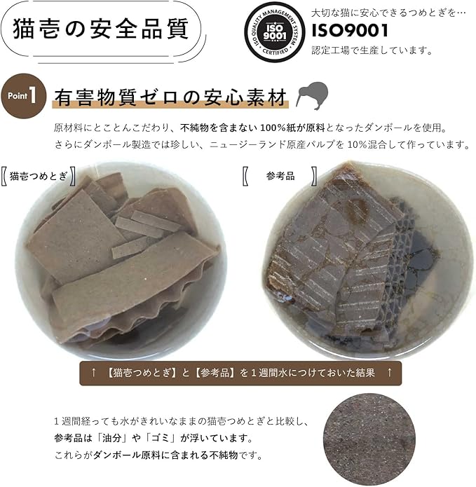 つめとぎ部分に使用しているダンボールは、原料の100%が紙。内10%はニュージーランド産原パルプ紙を使用。大切な猫に使用するつめとぎなので、品質にはとことんこだわりました。原料の品質が良いため、とぎくずも出づらくなっています。