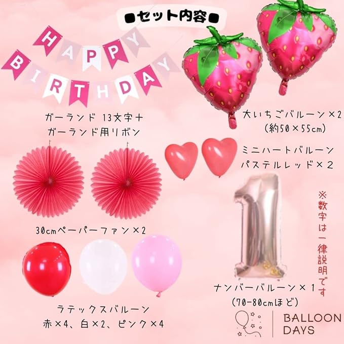 ■Happy Birthdayバースデーガーランド 13文字 ■ガーランド用リボン 1 ■ペーパーファン 2(30cm) ■ピンクナンバーバルーン(約80cm) 1 ■いちごアルミバルーン(約50 60cm) 2 ■ラテックスバルーン(赤 4、ピンク 4、白 2) ■ミニハートバルーン(パステルレッド 2) ※記載サイズは膨らませる前の平置きサイズです こちらは細かい風船が少なく、 準備される方も楽々なセット内容となっております★* アルミバルーンはお誕生日のお祝いが終わったあとも飾っておけておすすめですよ♪ 春生まれのお子様や、いちごが大好きな1歳2歳3歳4歳5歳6歳あたりの男の子や女の子が大喜びすること間違いなし! バルーンでは記念日、誕生日パーティー、ベビーシャワー、お祝い、100日記念、ハーフバースデーなどの大切なイベントで簡単に豪華な飾り付けが叶います☆ もちろん、インスタ映えなお店や会場の装飾、思い出に残るフォトブースや子供部屋といったお部屋の飾り付けなどにも大活躍♪