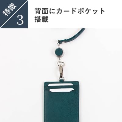 素材:牛革・ミネルバボックス。背面には嬉しい2ポケットのカード入れがついています。名札だけではなく、裏に社員証や入館証、またICカードや定期などを入れて一つで複数の使い方ができるアイテムです。
