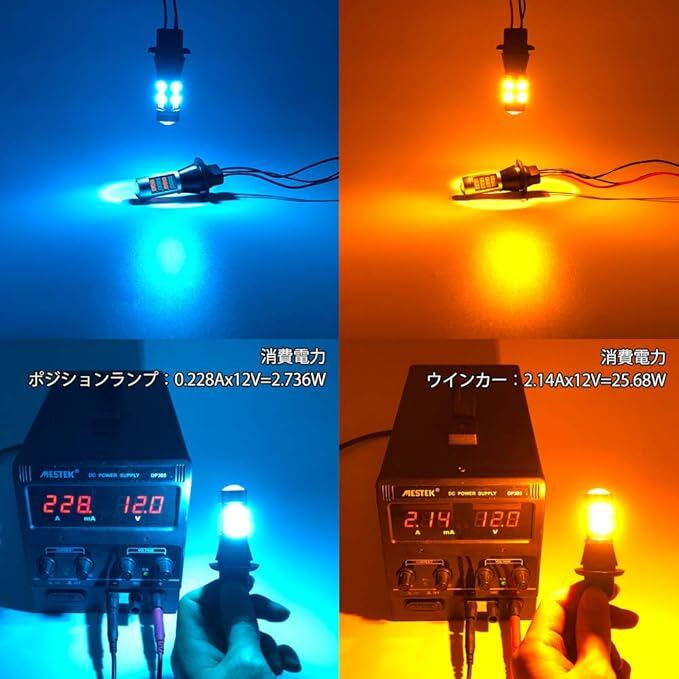 『2色切替』本製品は、ウインカーランプにスモールランプの役割を持たすことが出来ます。1つのLEDバルブがアンバーやアイスブルーに発光します。通常時:アイスブルー(スモール点灯)。ウィンカーON: アイスブルーが消灯し、アンバーが点灯する。ウィンカーOFF: アンバーが消灯し、アイスブルーに戻ります。