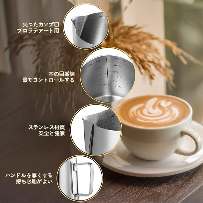 目盛り付き:目盛り付き、液量をコントロールしやすし、初心者にも扱いやすいです。 功能:ミルクをスチームで撹拌する際、ミルクがよりスムーズに回転し泡立ち豊かと更にきめ細かなミルクを作り出します。