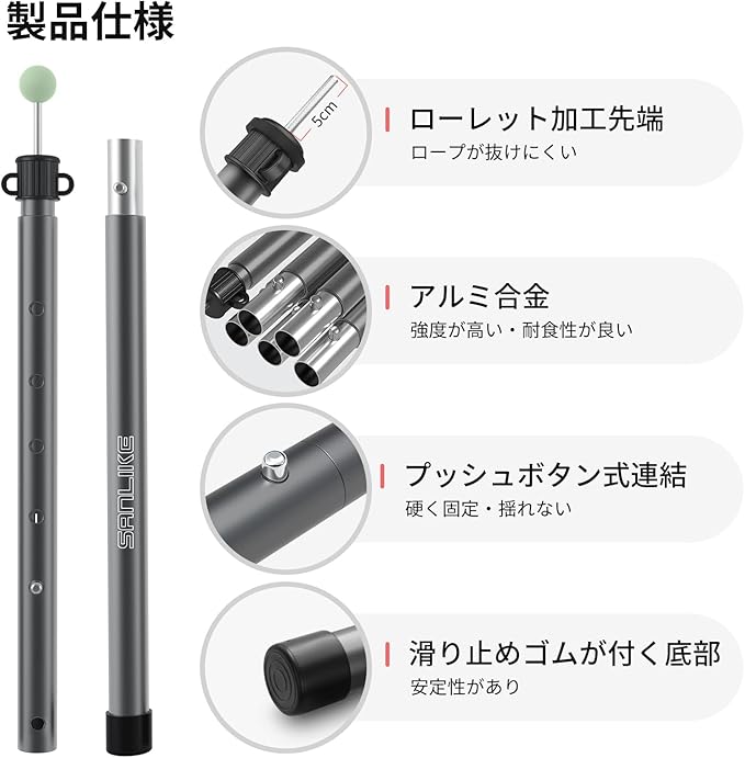【ポッシュボタン式】プッシュボタン式で、差し込むだけでストッパーによって連結部分がしっかり固定されます。抜き出したり、差し込んだり、組立や撤収を簡単に行え、連結本数を変えることによって長さを調節しやすいです。