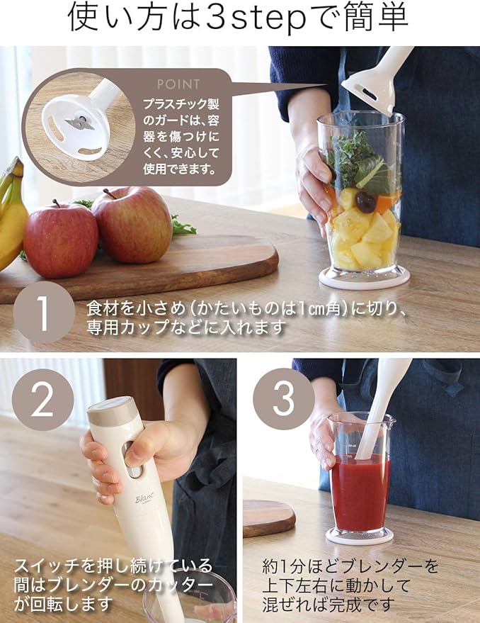 プラスチック製のガードは、容器を傷つけにくく、安心して使用できます。付属品の専用カップの底には、シリコン製の滑り止めがついています。dretec(ドリテック)のハンドブレンダー は手に取っていただく全てのお客様に使いさすさと安心をご提供します。
