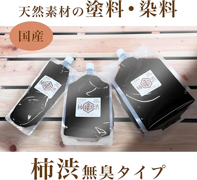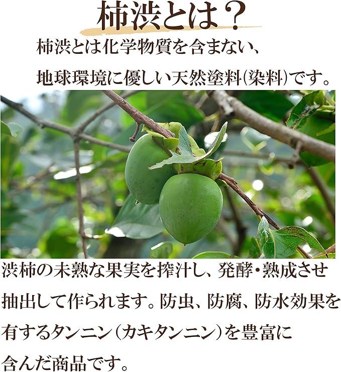【柿渋とは?】柿渋は天然素材の塗料です。こちらは、柿渋特有の臭いの元となる天然物由来成分(柿タンニン)を物理的な濾過だけで分離して臭いを解消した無臭タイプとなっております。