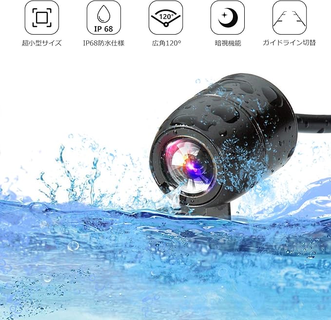 【ナイトビジョン対応】視野角度120度、0.5ルクスの低照度で夜でもしっかり車後方の状況をモニターに映れます。IP67防水仕様、丸型 コンパクト設計で、室内はもちろん、車外への取り付けも可能です!