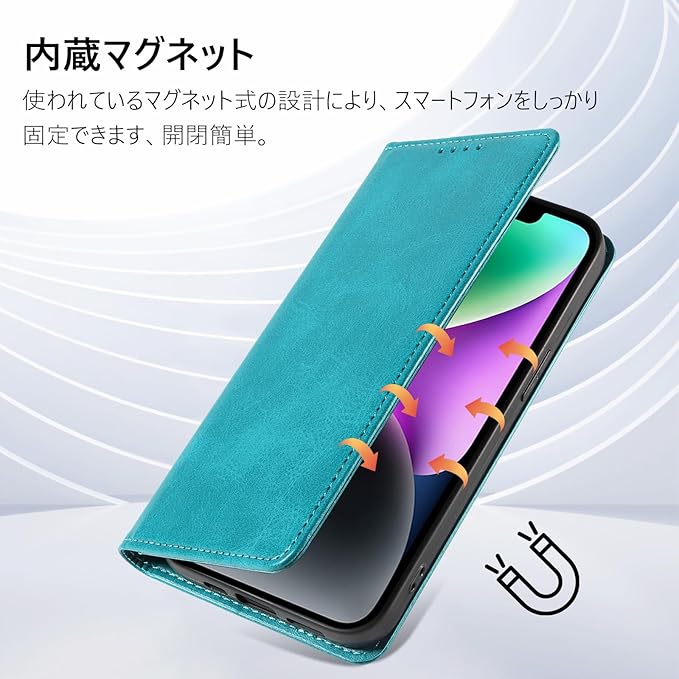 【多重保護】スマホケース iphone 14の四隅にラウンド処理がされており、衝撃吸収機能あり。内部のプラスチックはTPUソフトケースで、破損することはありません、取り付け・取り外しが簡単で、スマホ本体へのスレ傷が防止できます、衝撃から本体を360 保護します。使われているマグネット式の設計により、スマートフォンをしっかり固定できます、開閉簡単。