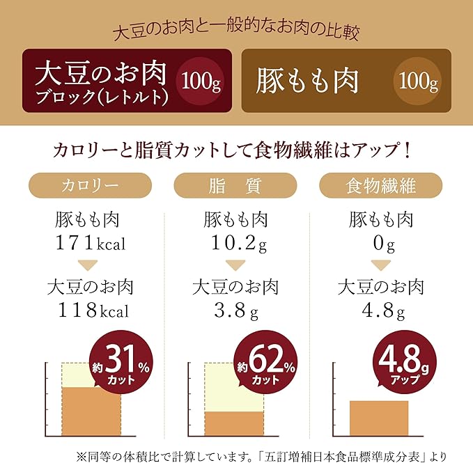 【動物性原料不使用】大豆の栄養を手軽に食べられ、高たんぱくでお肉と比べるとカロリー・コレステロールが低く、低脂質。動物性原料不使用で、野菜炒めや回鍋肉など様々な料理に使えます。