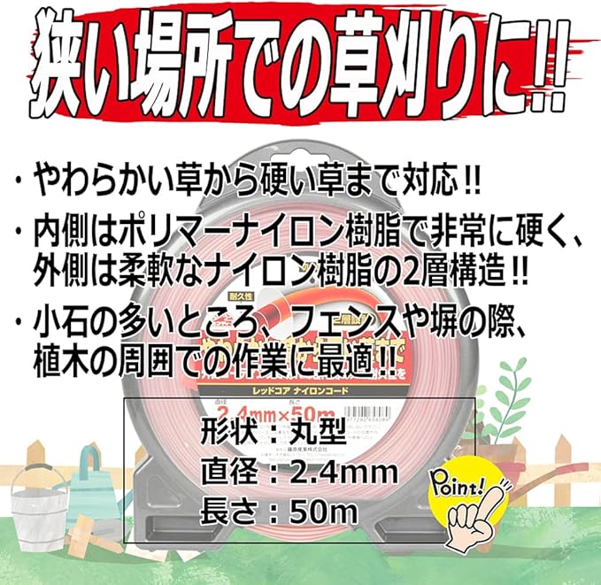 セフティー3(Safety-3) 草刈・刈払機用 やわらかい草から硬い草まで レッドコア ナイロンコード 50m 丸型 2.4mm径