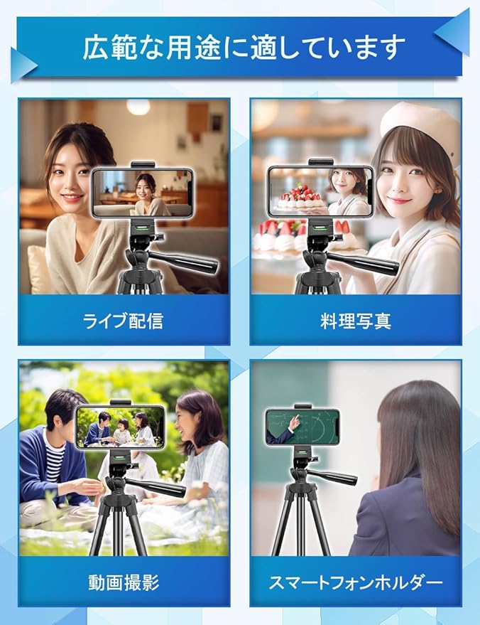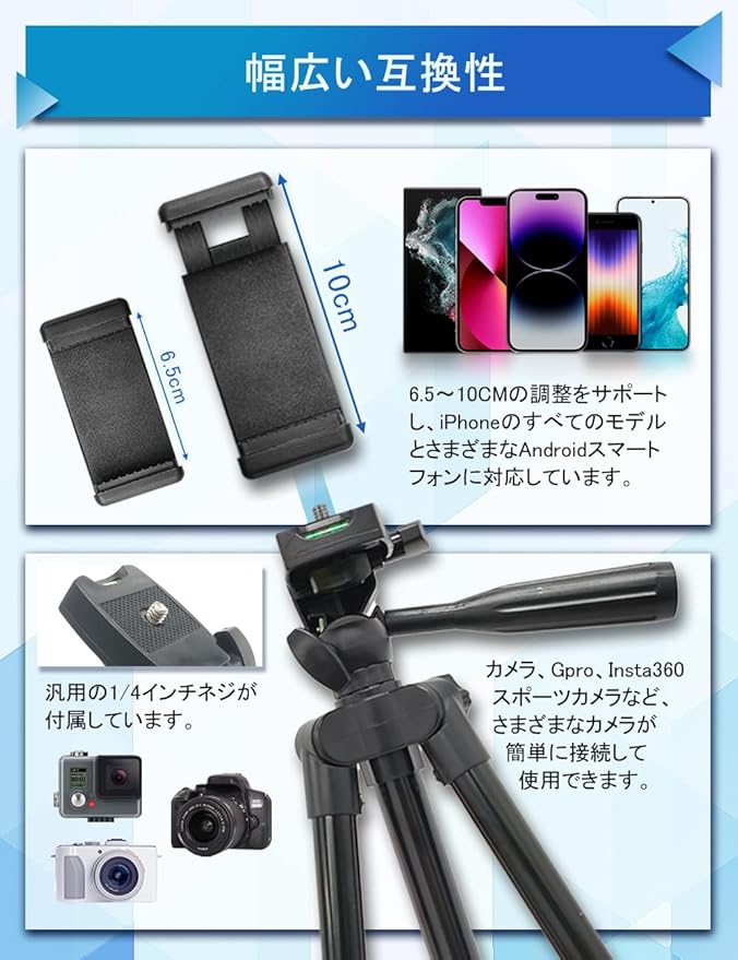 「多設備対応」三脚は1.5kgのカメラやスマホを設置可能 付属のスマホホルダーは展開サイズ6.5cm-10cmでサイズ4.7インチから6.7インチまでのアイホンやAndroidスマホをきっちり固定可能 三脚は3WAY雲台付きでカメラを360 自由に回転可能なので、より自然な角度を写真を取れる
