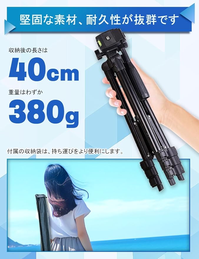 「超軽量&4段階伸縮」バージョンアップ三脚、軽量アルミ合金採用、高強度でただ380g、収納後のサイズは40cmで高さは40cmから130cmまで4段階伸縮で多場景に適用 屋外撮影愛好者にとって、ただミネラルウォーター一本の重量で旅行や山登り、歩行には持ち運びやすくて負担なし 生ライブ配信者にとって、4段階伸縮可能の三脚は各身長、多場景に適用でより完璧な角度から放送内容を撮影可能